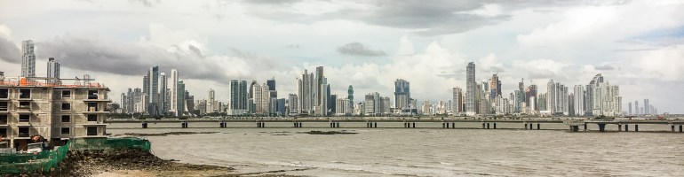 We continued our tour, eventually finding ourselves in a park that juts out into the body of water that serves on one side as the entrance to the Canal, and on the other borders downtown Panama City. This is the Plaza de Francia, with the Instituto Nacional de Cultura as its central building and a giant obelisk as its central attraction. A stairway winds around the obelisk and up to a walkway above the Cultural Institute, and so I leave Gwen at the bottom of the stairs and climb. At the top is a view to a highway raised just above the water running all the way around this little peninsula. Looking to the left, I am treated to a breathtaking view of Panama City’s skyline.