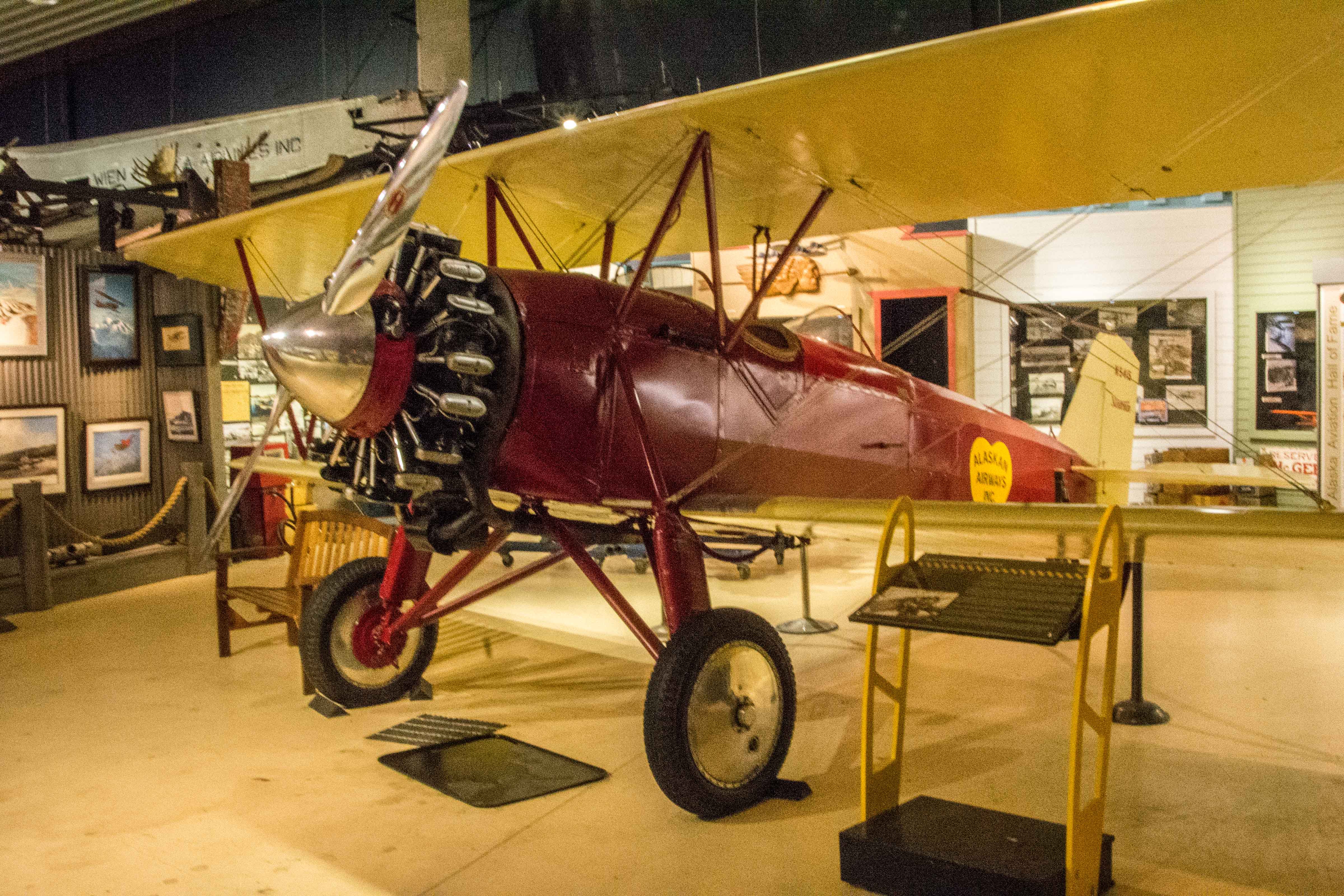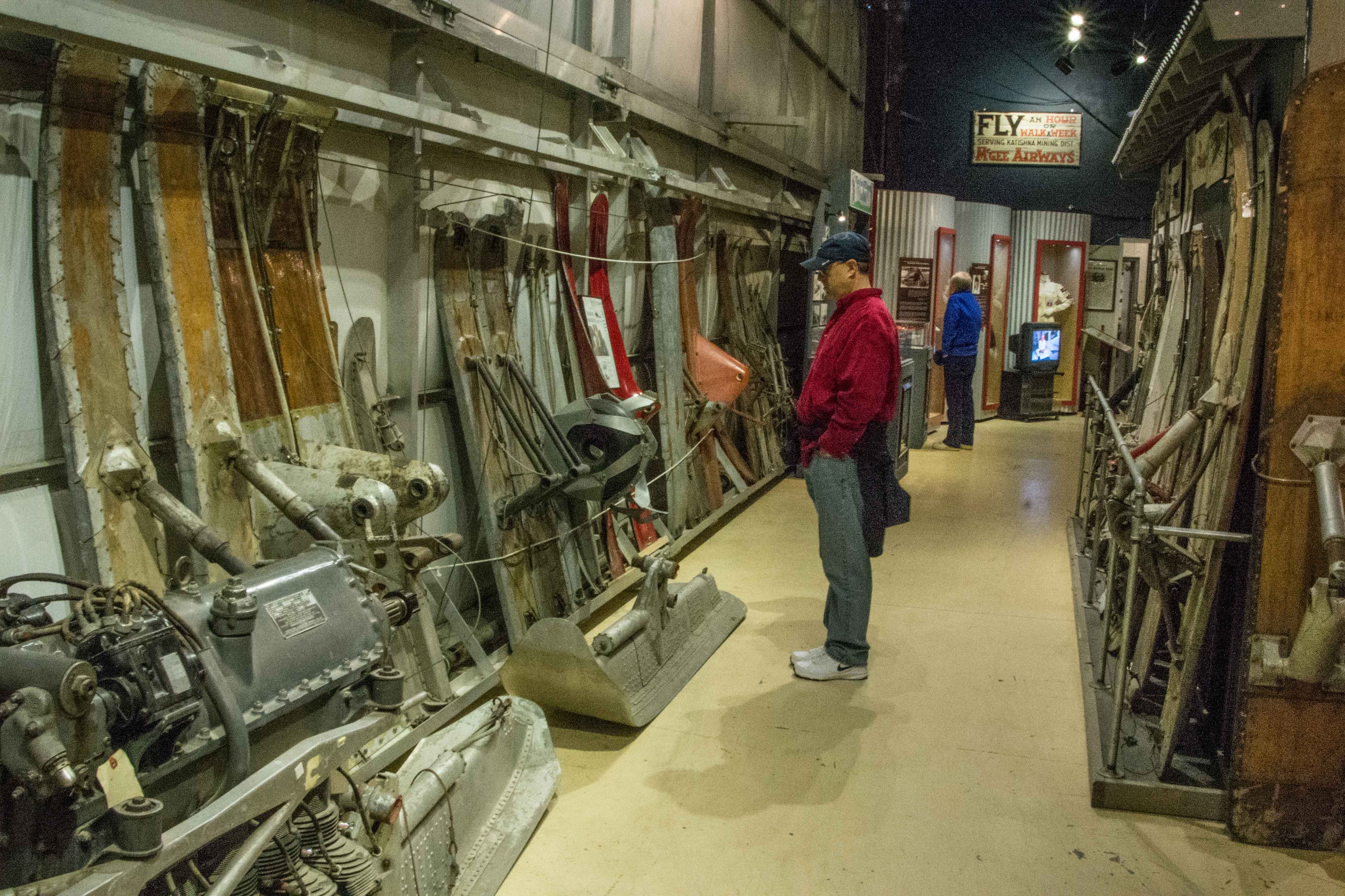 The first thing we did today was go visit the Anchorage Air Museum. This is smaller and more colloquial than the Palm Springs Air Museum, but really quite well done. The focus is on the early air pioneers in Alaska, starting with the first airplane brought here. This was in 1913, when James V. Martin and his wife Lilly were invited to bring their airplane “show” to Anchorage for the July 4th celebration. Flight was not established enough for them to fly their machine to Fairbanks, so they disassembled it and shipped it piece by piece. The “show” was the plane being flown for short-duration flight demonstrations for three days in July, starting on the 4th. The Martin entourage and the plane got to Anchorage well ahead of time, and the Martins were feted by the locals. In between fetes, the plane got put back together, and after some adjustments, it flew. It took several trips (none longer than 20 minutes), and the demonstration was over. Martin tried to sell the plane locally, but got no offers, so he and the team disassembled it and sent it back to the lower 48. Commercial aviation finally came to Alaska in 1923, and thus began the era of the bush pilot, which continues to this day. The museum in its main building had several examples of these early planes as well as early engines, wings, propellers, skids, floats and assorted air service costumes.