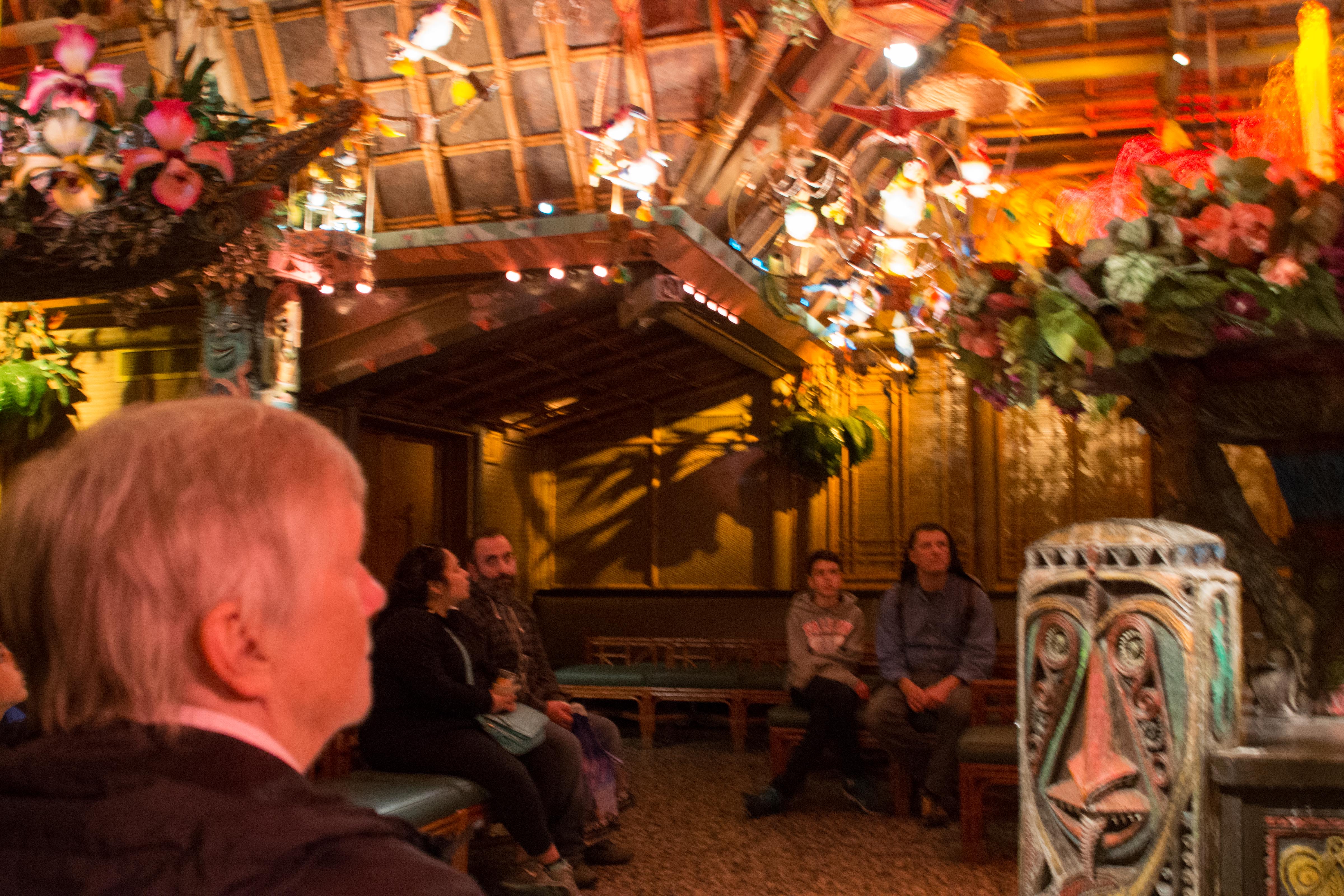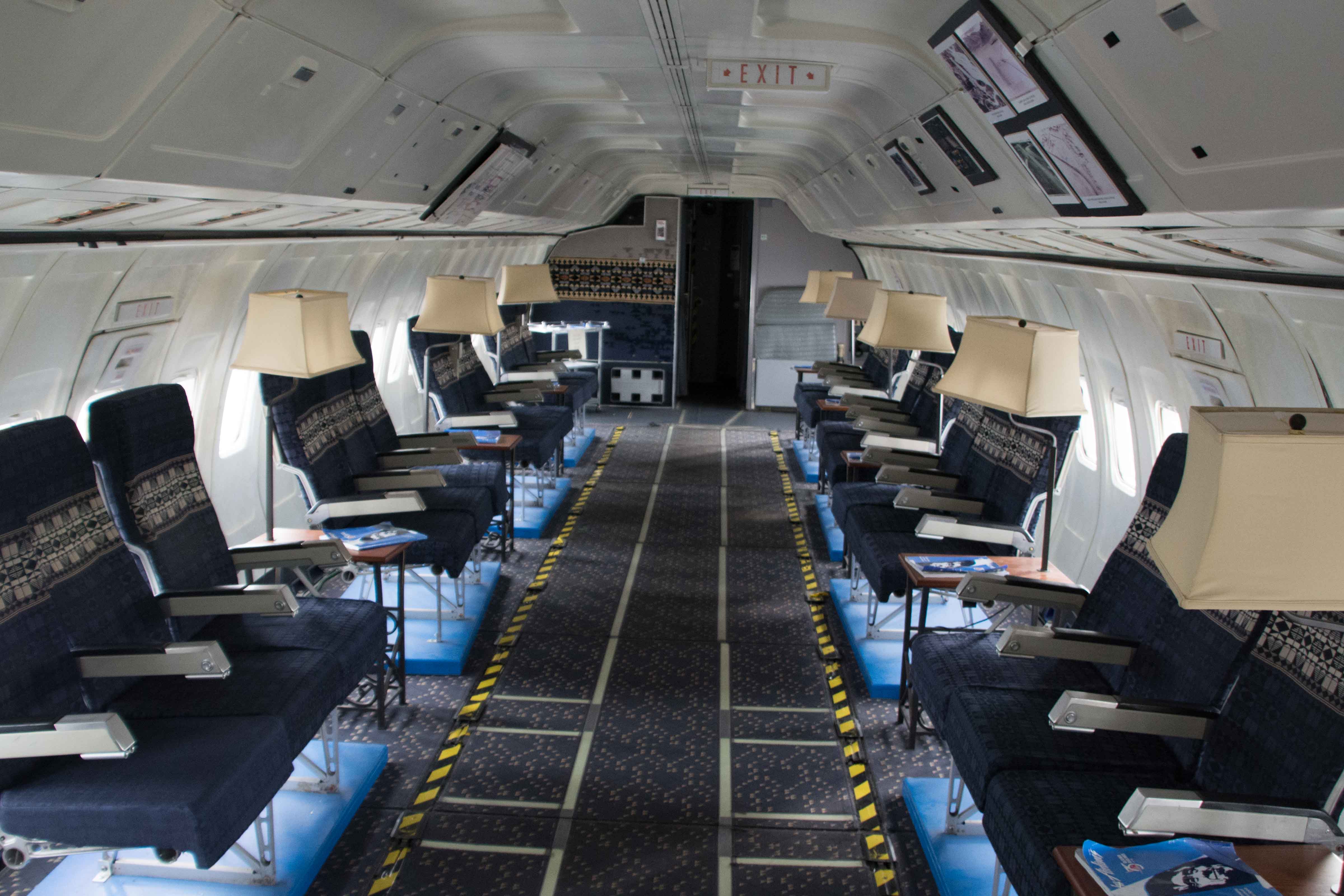 The Guppy is parked outside the buildings with a stairway allowing entrance into the craft right behind the pilots’ seats. Inside, the pilot and copilot chairs are on the right, and as you turn to the left, there is a kitchen area, and then the seats. The seat chairs sit facing each other, with perhaps eight seats on a side. Each has a floor lamp behind it giving it the look of a number of living room set side-by-side and face-to-face.