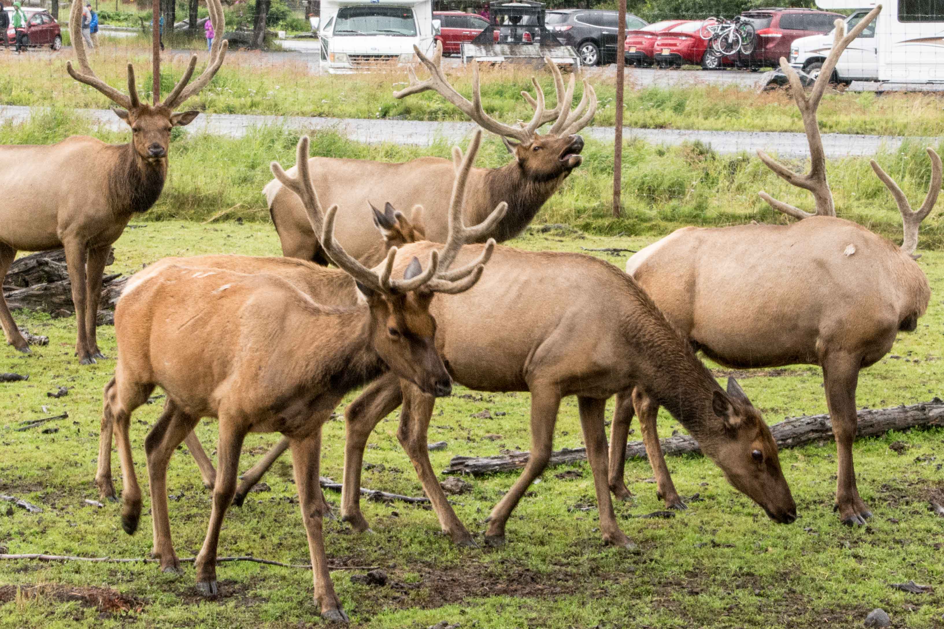 On the way to and from the Conservation Center we went along beside Cook’s Inlet which is very wide, but not very deep. Lots of the bay area was sand, as it was closer to low tide than high tide, but we could see on our way back an hour or so later that the water was coming back into the bay. The weather was strange, although perhaps not so strange for Alaska. It was cloudy and dull in Anchorage, but not raining much. As we got to the Conservation Center about 50 miles south of Anchorage, the rain was really coming down. Coming back to Anchorage, the rain eased off, and disappeared altogether by the time we got back to the hotel. The clouds climbed down the mountains that surrounded us, showing a low ceiling we could see as we approached. We passed by Beluga Point where the whales of that type are supposed to be easily seen at the right time of year. We stopped, but didn’t see any.