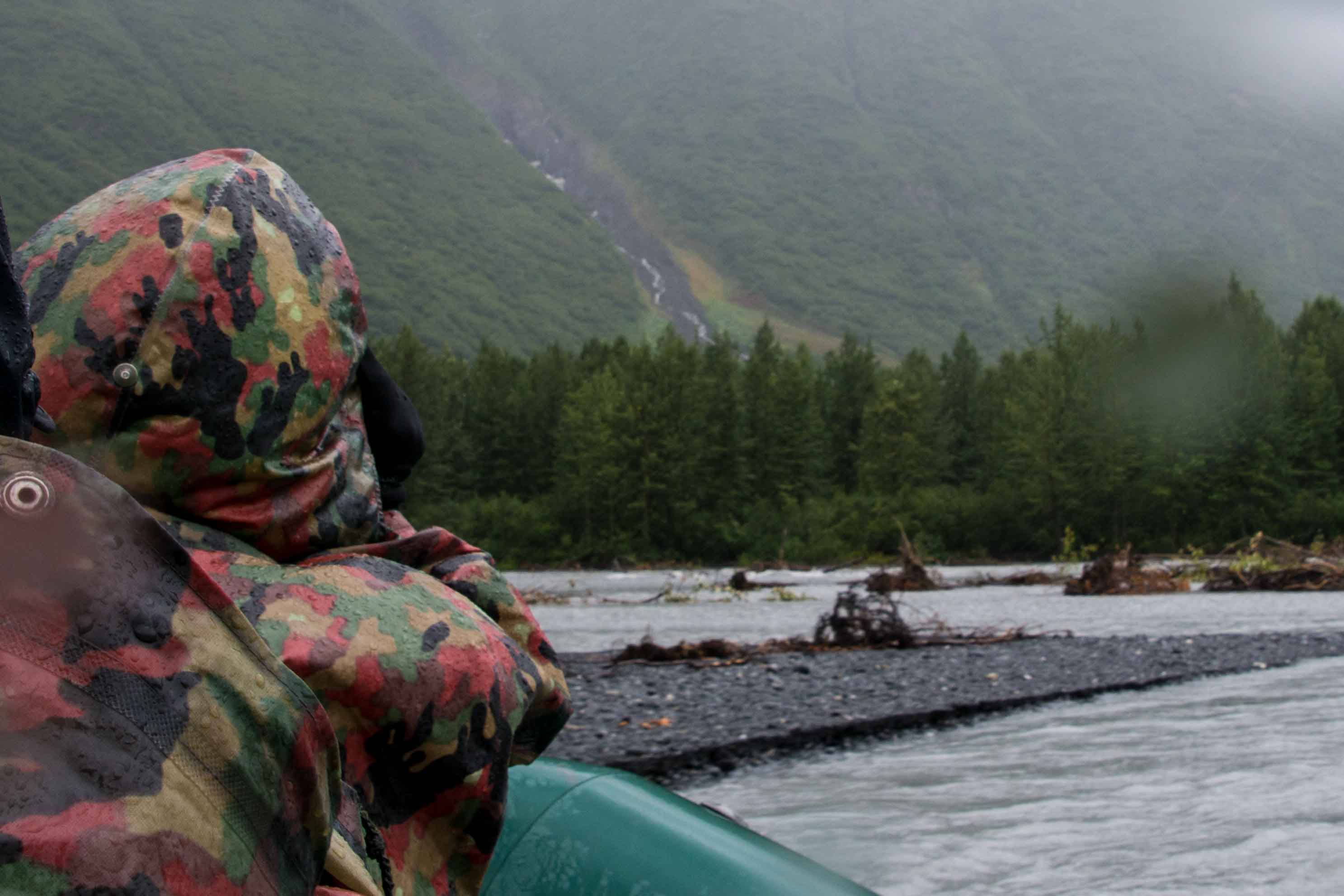 After about 45 minutes floating around among the icebergs, we ‘find’ the river mouth and float into it. Almost immediately into this leg of the trip, we encounter mild rapids (class 2-, we were told). This bounces u a bit, adding some excitement to the day. The extra stimulation is a useful diversion, as the weather is worsening, the rain is getting more insistent, and the wind is picking up. The dark clouds are back, and my feet are freezing. I have the uncomfortable feeling that maybe I have water in my boots, although that turns out when I finally get to take them off, not to be the case. The difficulty was simply that the rubber boots were very good conductors of heat away from my feet into the cold water collecting around the edges of the raft. Just about this time, Gus announces that we have about another hour to go. This didn’t make anyone particularly happy, but there is nothing to be done. Gus did a good job navigating us, as well as trying to describe what we were able to see around us, in part I think to help us keep our minds off the rain. At a point down the river, we come upon a beaver dam on the left hand side. It is clear that the beaver is still manning it, as the part of the river to the left of the dam is about a foot higher than the part we were traveling through. Unfortunately we don’t see the beaver, although Gus assures us that others before us have.